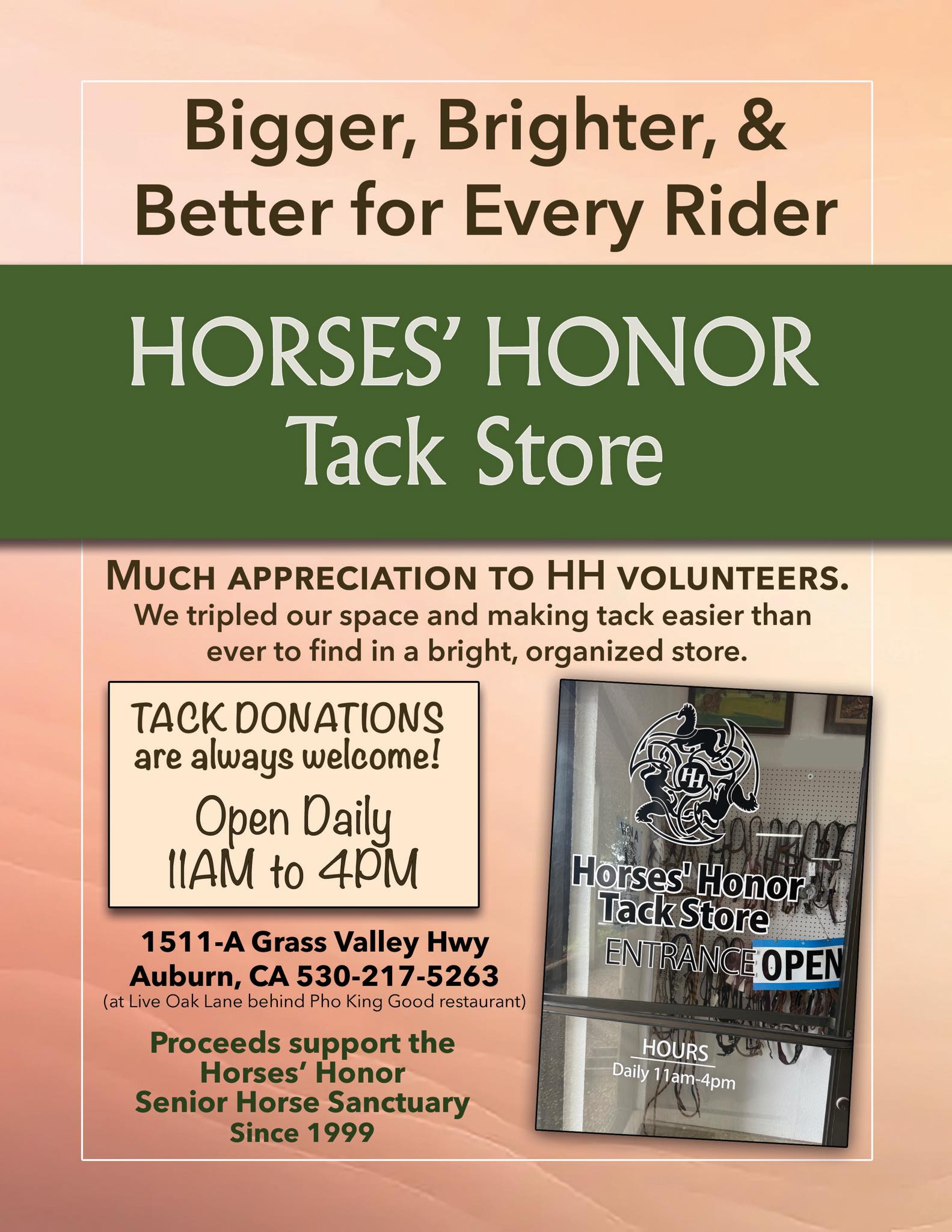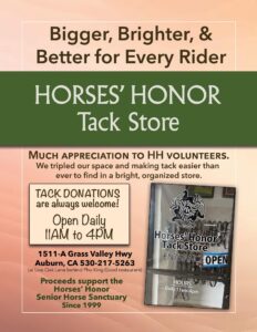 VISIT OUR TACK STORE PAGE HERE for all the details and how to make donations of used tack and equipment. Now open daily, 11am-4pm!